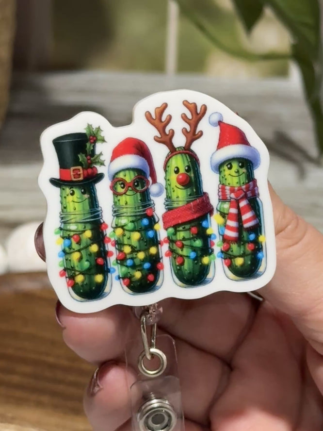 Add some holiday humor to your daily routine with the Christmas Festive Pickles Retractable Badge Reel! This fun and quirky badge holder features a playful design of four adorable pickles dressed for the season—complete with Santa hats, reindeer antlers, and festive accessories. Perfect for anyone who loves a whimsical twist on their accessories, this badge reel is sure to bring smiles at work, school, or any event.