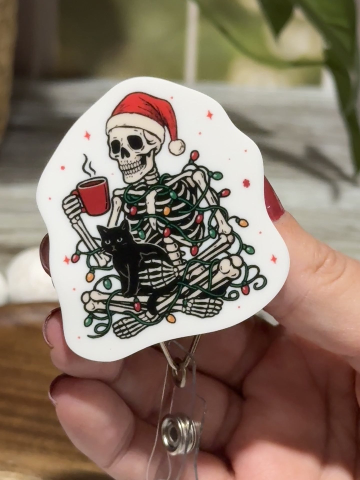 Add some holiday humor and spooky charm to your workday with this unique skeleton badge reel—sure to bring smiles and a little festive spirit wherever you go!