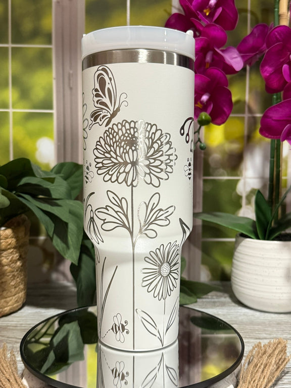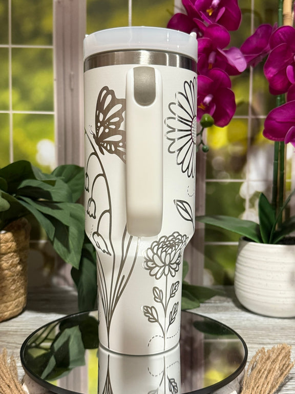This 40oz white handled tumbler cup features our Floral Bees & Butterflies design, beautifully laser engraved with blossoms, buzzing bees, and fluttering butterflies. Crisp, clean, and timeless, this cup captures the joy of spring while keeping your drinks the perfect temperature.