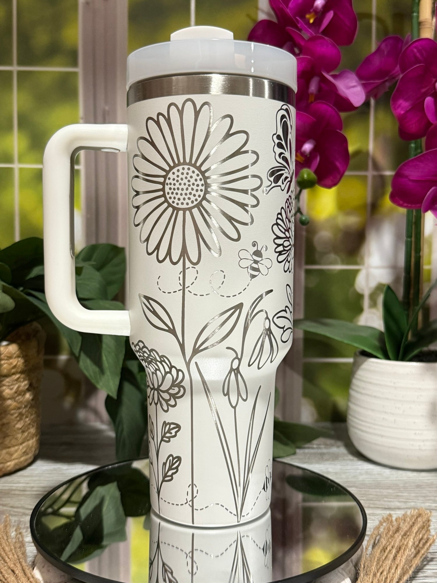 Floral Bees & Butterflies 40oz White Tumbler Cup with Handle – laser engraved Spring Design, Ready to Ship