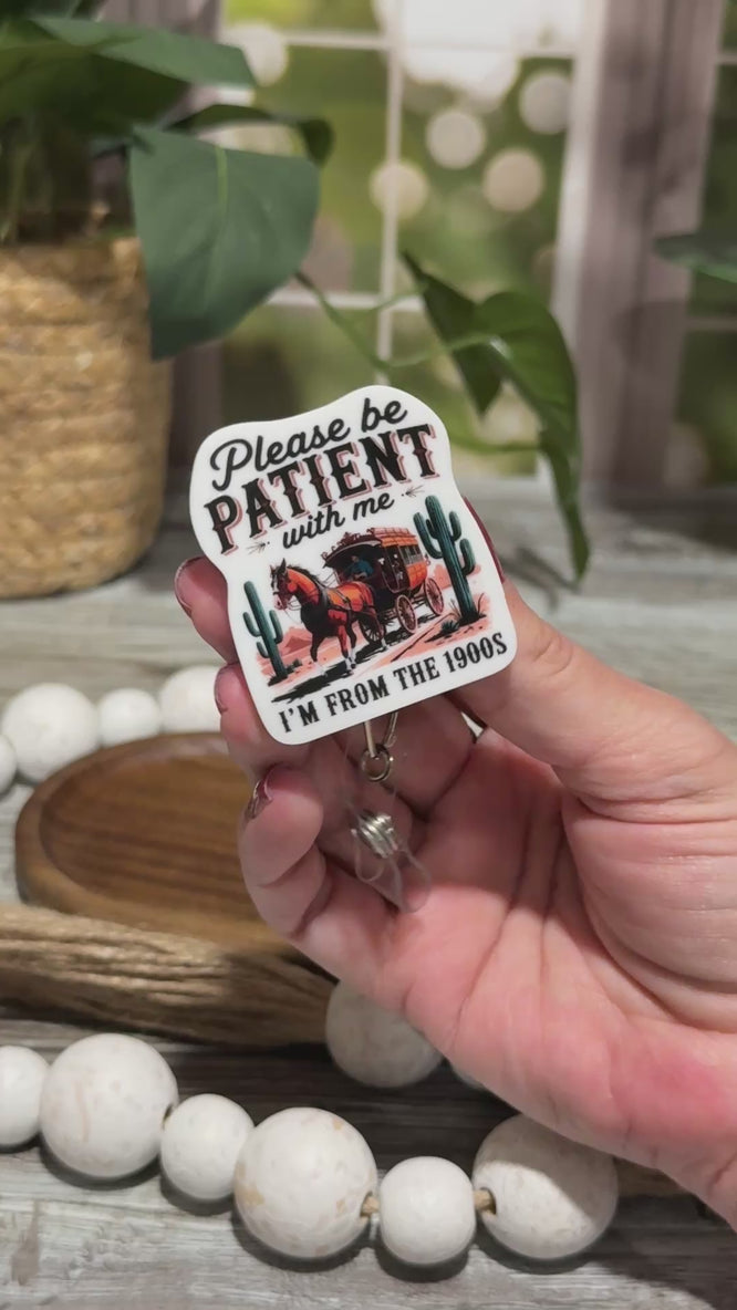 Add a touch of humor and vintage charm to your daily routine with the I'm From The 1900's Retractable Badge Reel! Featuring a playful, lighthearted design that says "Please be patient with me, I'm from the 1900's," this fun accessory is perfect for anyone who loves a bit of nostalgia, wit, and personality in their workday essentials. Whether you're a nurse, teacher, office worker, or simply a fan of quirky, whimsical decor, this badge reel is sure to bring a smile to your face and brighten up your shift.